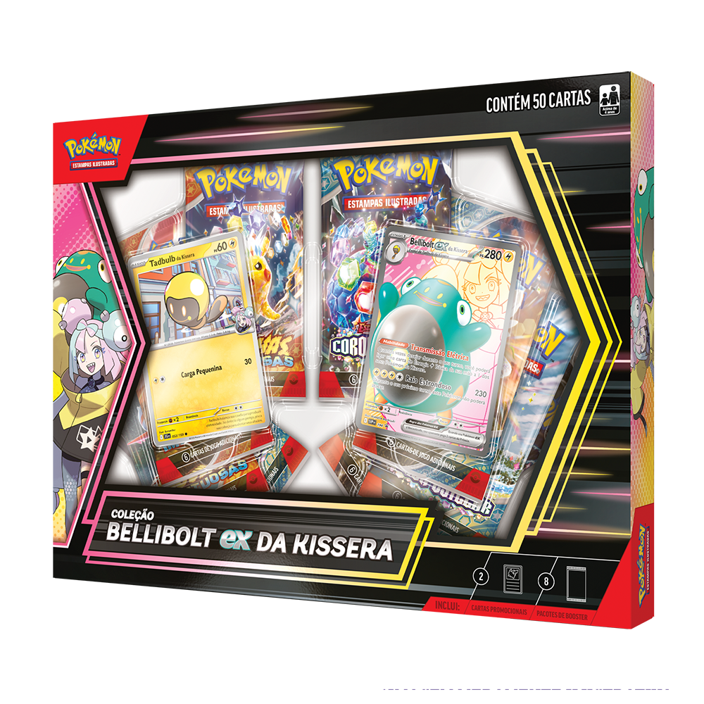 Conteúdo da embalagem: 1 carta holográfica promocional de Bellibolt ex da Kissera, 1 carta holográfica de Tadbulb da Kissera, 8 pacotes de booster do Pokémon Estampas Ilustradas e 1 carta-código para o Pokémon Estampas Ilustradas LIVE