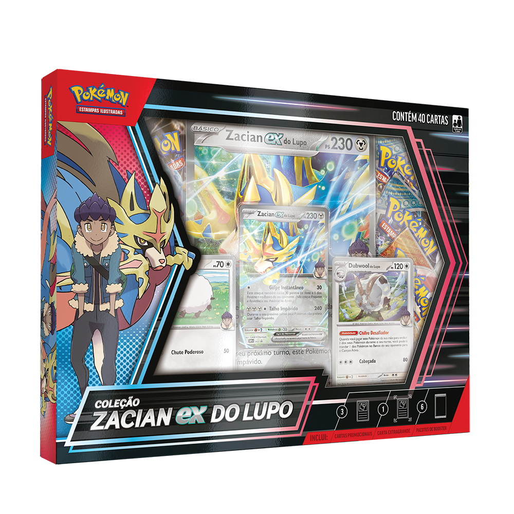 Conteúdo da embalagem: 1 carta holográfica promocional de Zacian ex do Lupo, 2 cartas holográficas de Wooloo do Lupo e Dubwool do Lupo, 1 carta holográfica extragrande de Zacian ex do Lupo, 6 pacotes de booster do Pokémon Estampas Ilustradas e 1 carta-código para o Pokémon Estampas Ilustradas LIVE