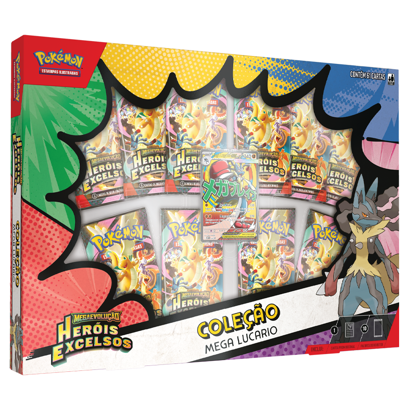 Cada versão da coleção apresenta uma carta laminada promocional com arte expandida de um desses Pokémon ex de Megaevolução, tornando-se um item de destaque tanto para jogadores quanto para colecionadores. Além disso, o produto inclui 10 pacotes de booster da expansão Megaevolução – Heróis Excelsos, oferecendo diversas oportunidades de encontrar cartas raras, fortalecer decks e explorar novas combinações estratégicas. A carta-código inclusa permite levar toda essa experiência também para o Pokémon Estampas Ilustradas Live. Produto oficial, ideal para quem busca poder, coleção e evolução em um único produto.