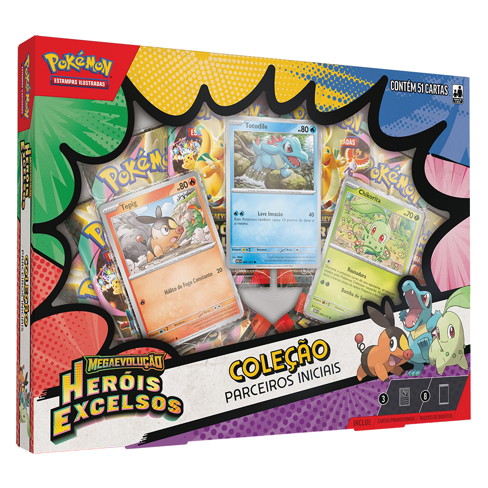 A Box Coleção Parceiros Iniciais ME02.5 é a escolha ideal para Treinadores que desejam começar uma nova jornada no Pokémon Estampas Ilustradas ao lado de companheiros clássicos. Chikorita, Tepig e Totodile representam os três tipos fundamentais: Planta, Fogo e Água e chegam em cartas laminadas promocionais que se destacam tanto nas batalhas quanto na coleção.