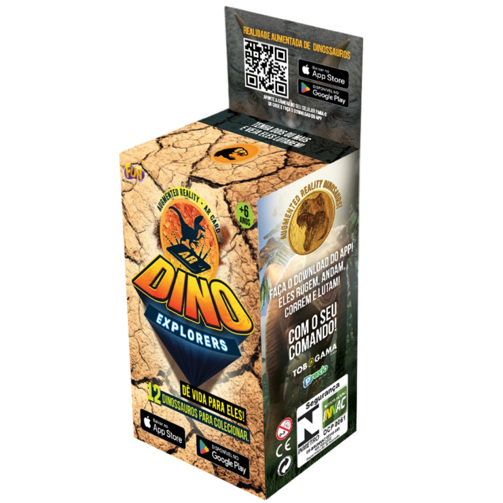 Componentes: 1 bloco fóssil, 1 ferramenta de escavação, 1 cartão QR Code com acesso ao app