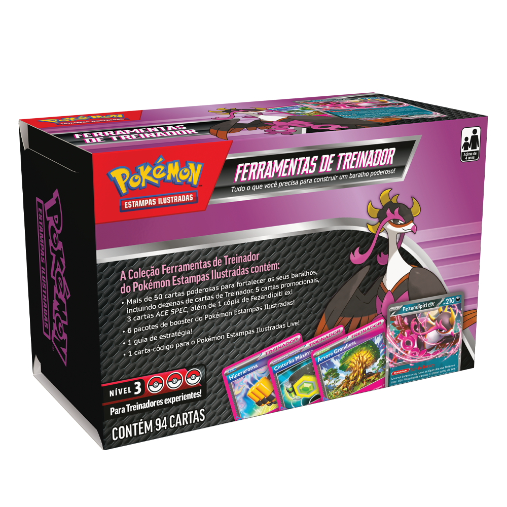 Aprimore suas estratégias e eleve o nível do seu jogo com a Ferramenta de Treinador Fezandipiti ex! Essa caixa foi criada especialmente para Treinadores experientes que desejam construir ou reforçar seus baralhos no Pokémon Estampas Ilustradas.